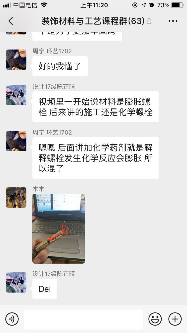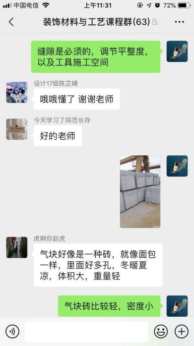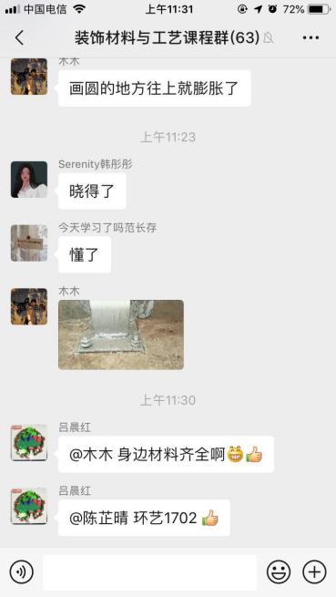 杨周吕晨红老师的装饰材料与工艺课程,在线上教学也起到了不错的效果,学生反馈热烈,以下是现场图片反馈。