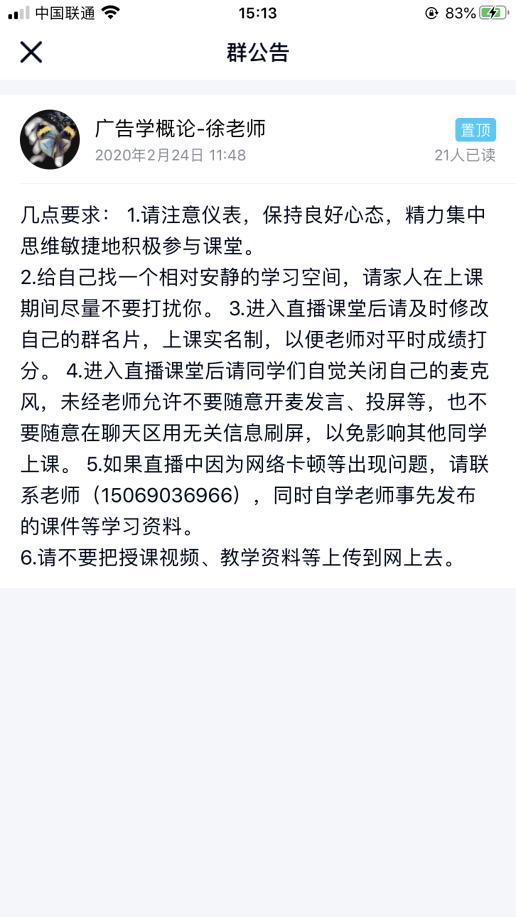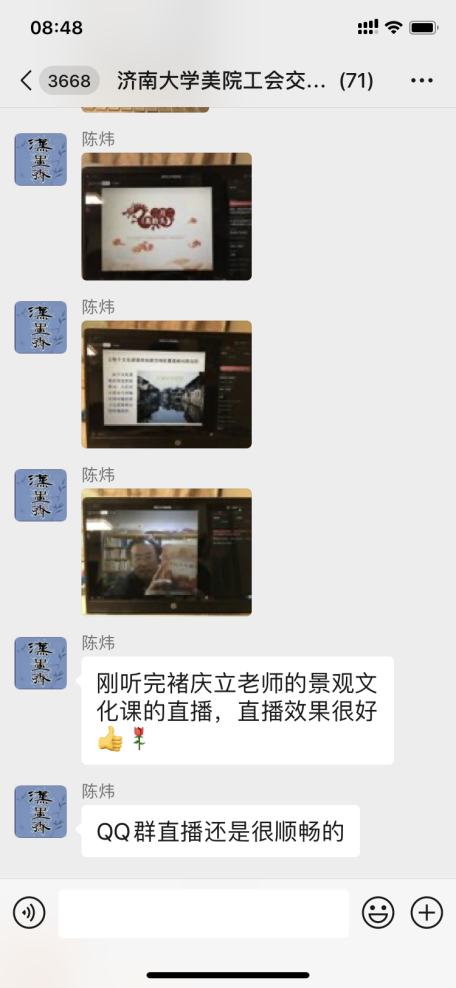 美术系褚庆立老师,承担纯理论课程,为了应对停课不停学的特殊时期的授课策略,在开学前就参加了学校教务系统组织的线上授课技能培训,试探了各种平台,最终的策略是学习通平台做文本资料储备,微信群交流作备份,QQ直播为首选。24日开学第一天,一切正常,直播讲解,ppt播放,视频插入如在教室中传统授课方式一样,顺畅而自然,三个小时一气呵成,研究生与系主任同时参与整个授课过程。课间还和学生逐个视频,反馈意见良好。学生普遍反映整堂课感觉收获很大,不仅吸引了学生,还吸引了学生家长一起听课。