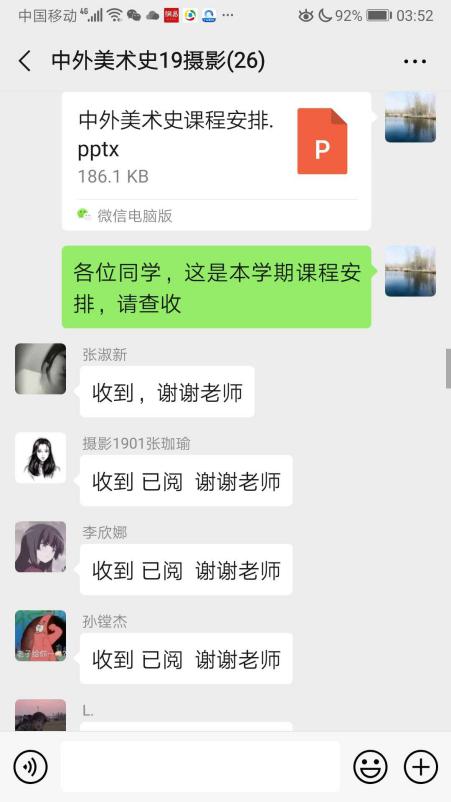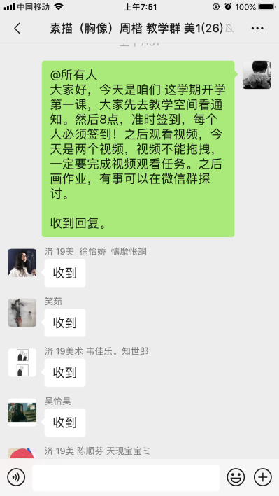 美术学周楷老师,通过学校网络平台建设课程,反复挑选网上精品课程,利用录屏软件制作ppt课程,精心打磨,充实课堂内容。从发布开课通知,早上8点准时开课,到监督学生任务完成情况,布置第二天任务,整个教学环节安排完整。