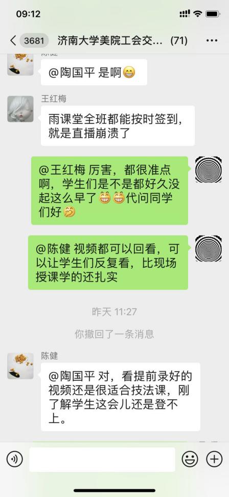 董传超临时接替外聘老师授课19设计3-4班68人,形式基础2课程在学习通录播课程。雨课堂授课翻车,学生白等,无直播权限。因课表是外聘老师。转战微信群发资料。