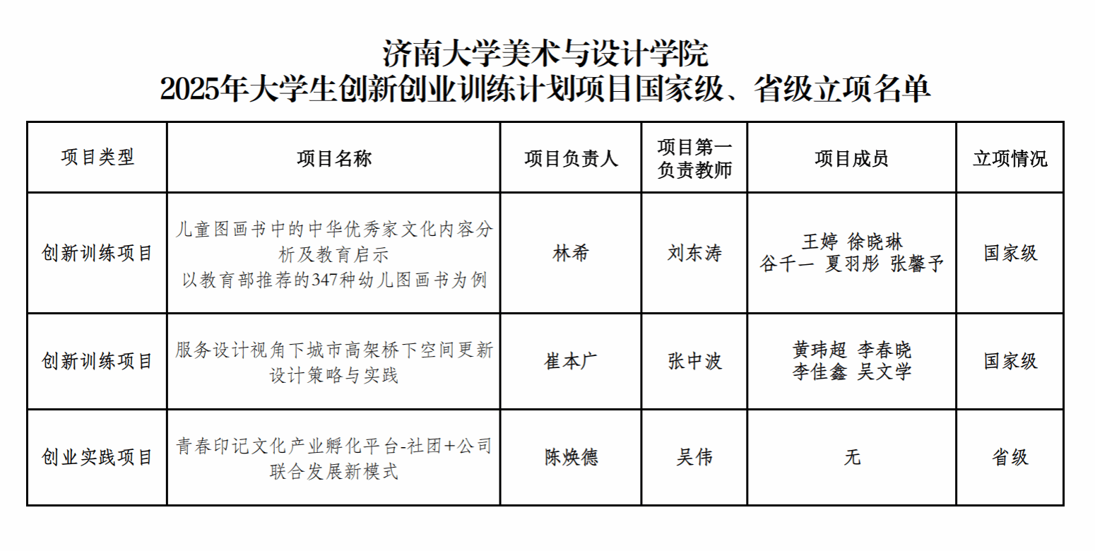 其中,由刘东涛老师指导,林希负责的项目《儿童图画书中的中华优秀家文化内容分析及教育启示——以教育部推荐的347种幼儿图画书为例》;由张中波、吕晨红老师指导,崔本广负责的项目《服务设计视角下城市高架桥下空间更新设计策略与实践》获批国家项目。由吴伟老师指导,陈焕德负责的《青春印记文化产业孵化平台-社团+公司联合发展新模式》获批省级项目。